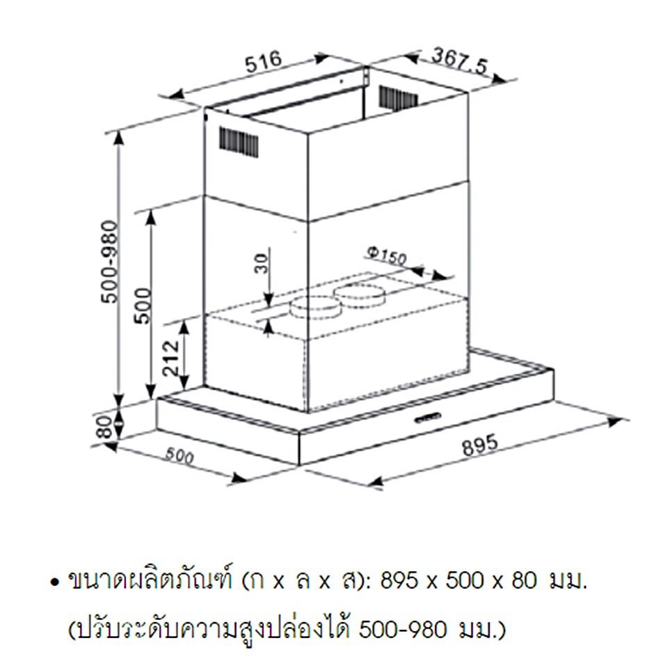 • ขนาดผลิตภัณฑ์(กxลxส): 895 x 500 X 80 มม.(ปรับระดับความสูงปล่องได้ 500-980 มม.)